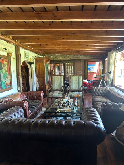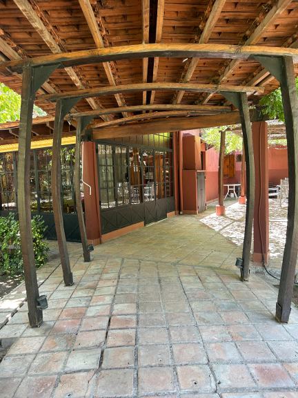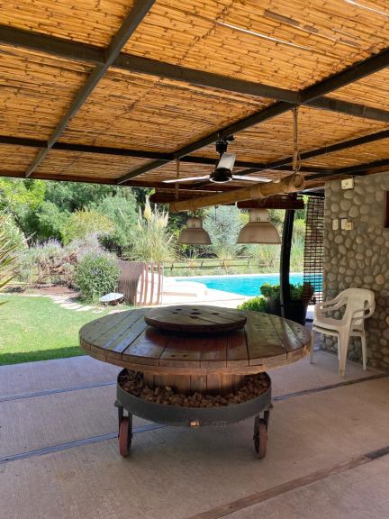 • Cochera exterior: construcción de 120 m², realizada con columnas de madera, techo de chapa y cielorraso de caña; con capacidad para 8 vehículos,